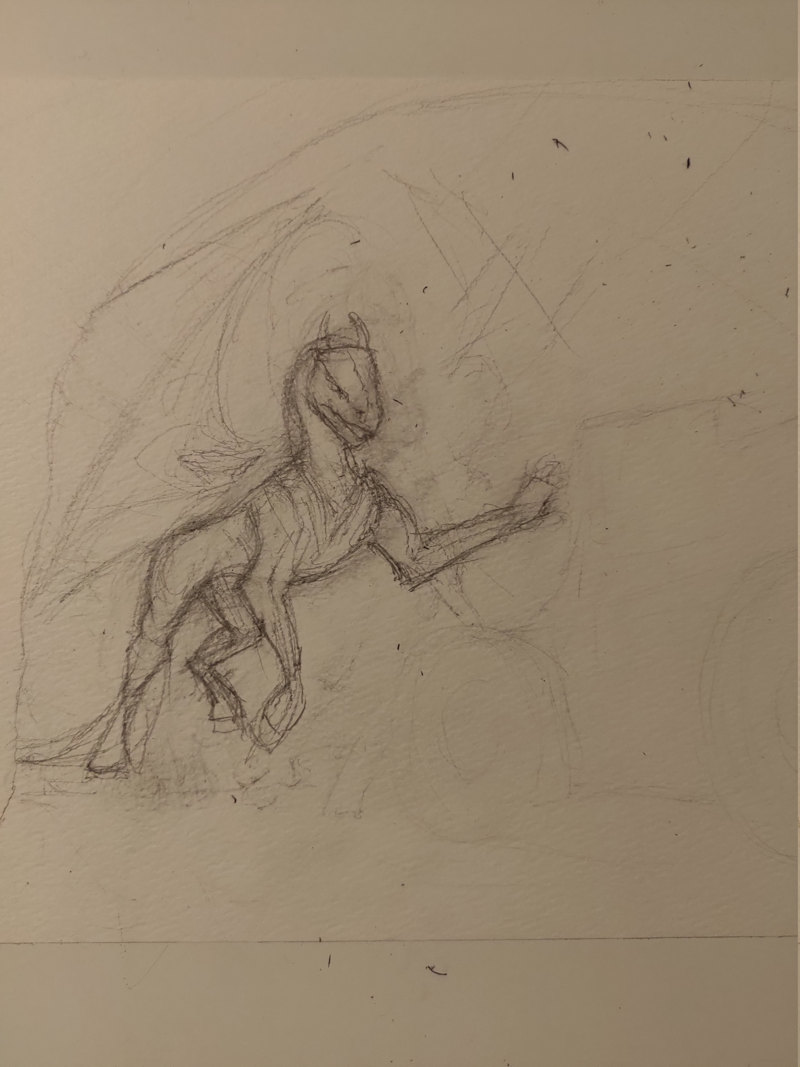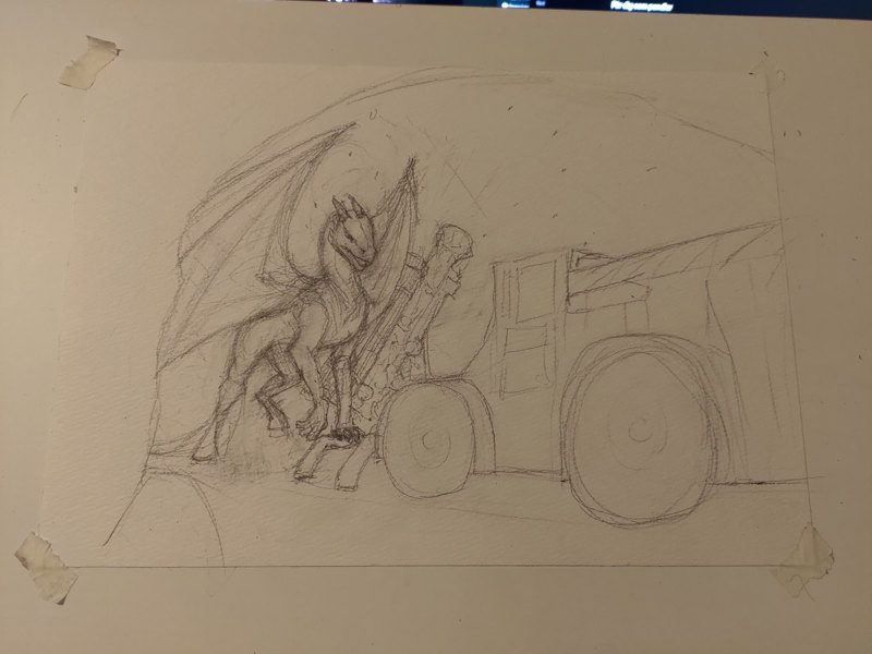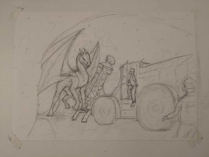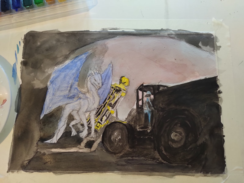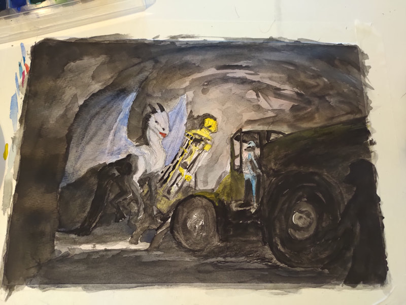 A watercolour painting of an underground mine. Workers meeting a dragon