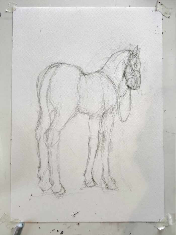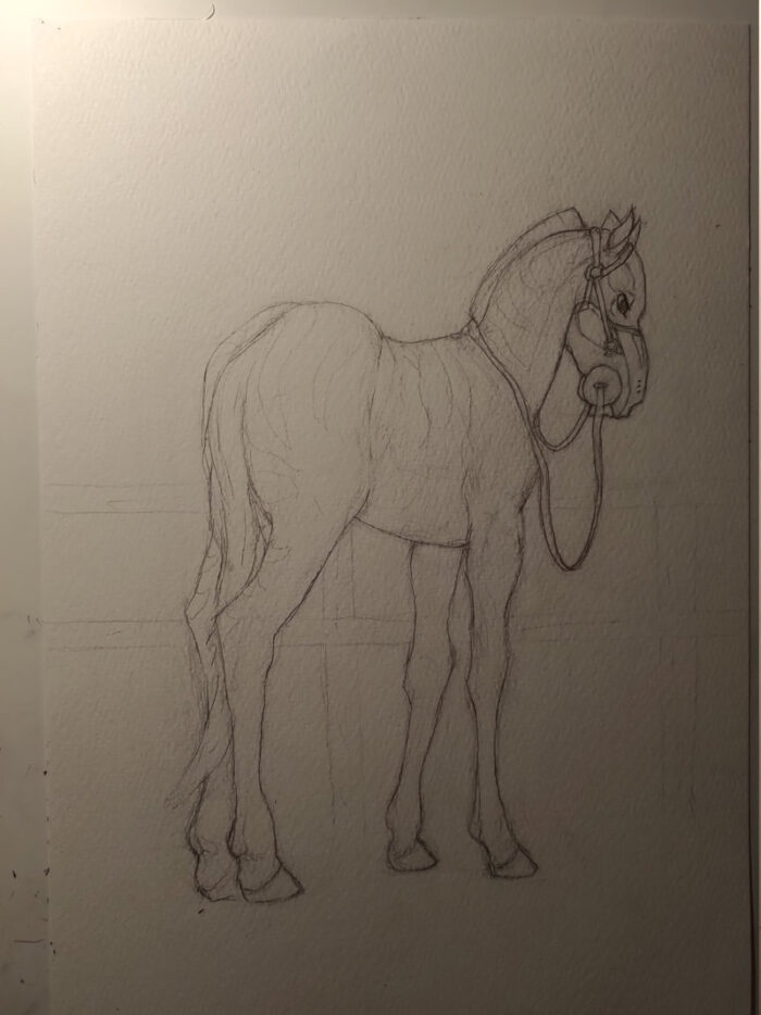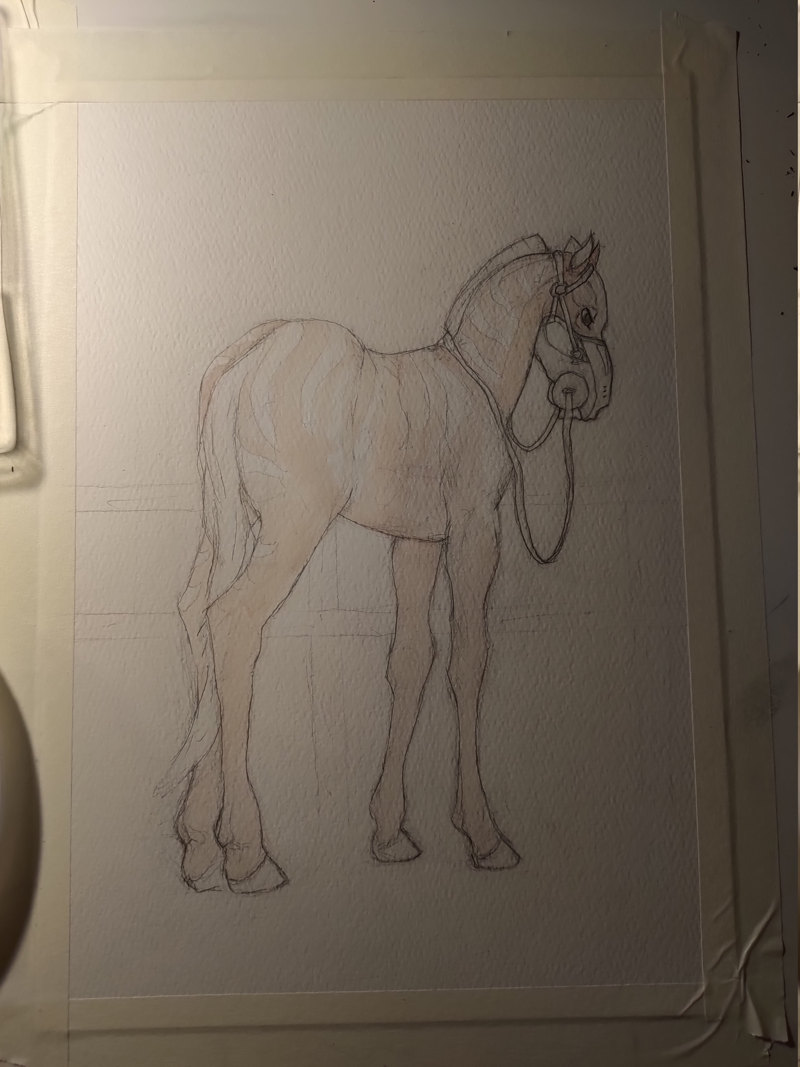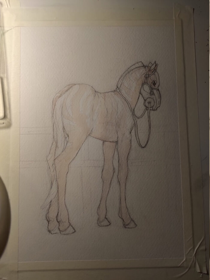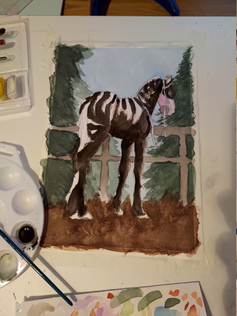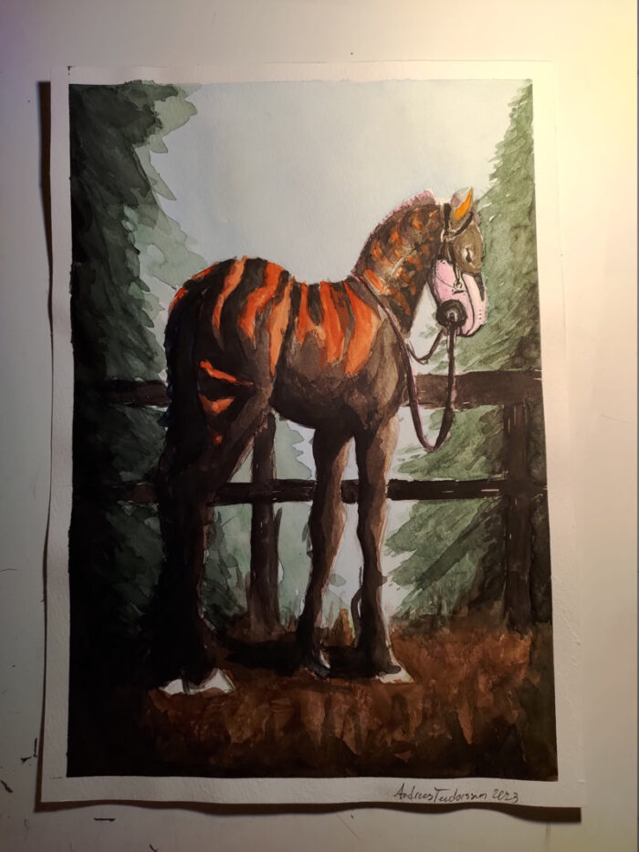 A watercolour painting of a red-striped horse with a pink hihg-tech gas mask